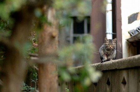 塀にしゃがんでる猫を見つけた。 目をギョロギョロさせておびえている。 なにか怖い目にあった様な目をして。 今にも逃げるぞ!って感じで。 体には糸の様なものが無数に巻きついている。 魚網にでもひっかったんだろうか。 糸が完全にとれなければ、 手や足を失うどころか、命さえ危ない。 頑張れ!!